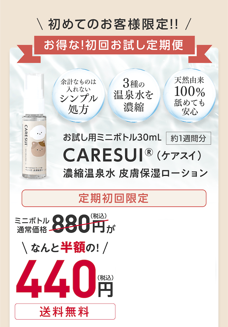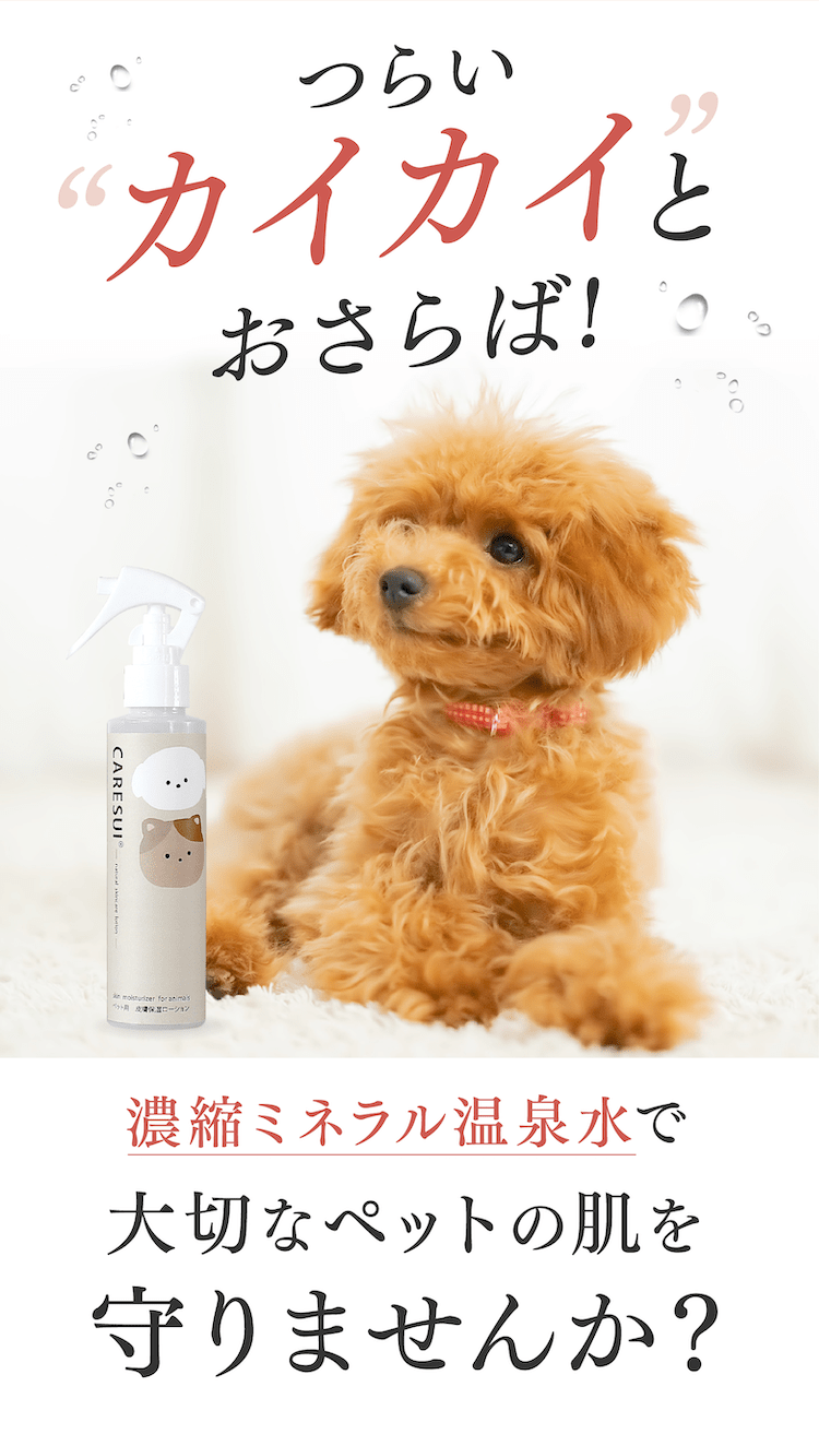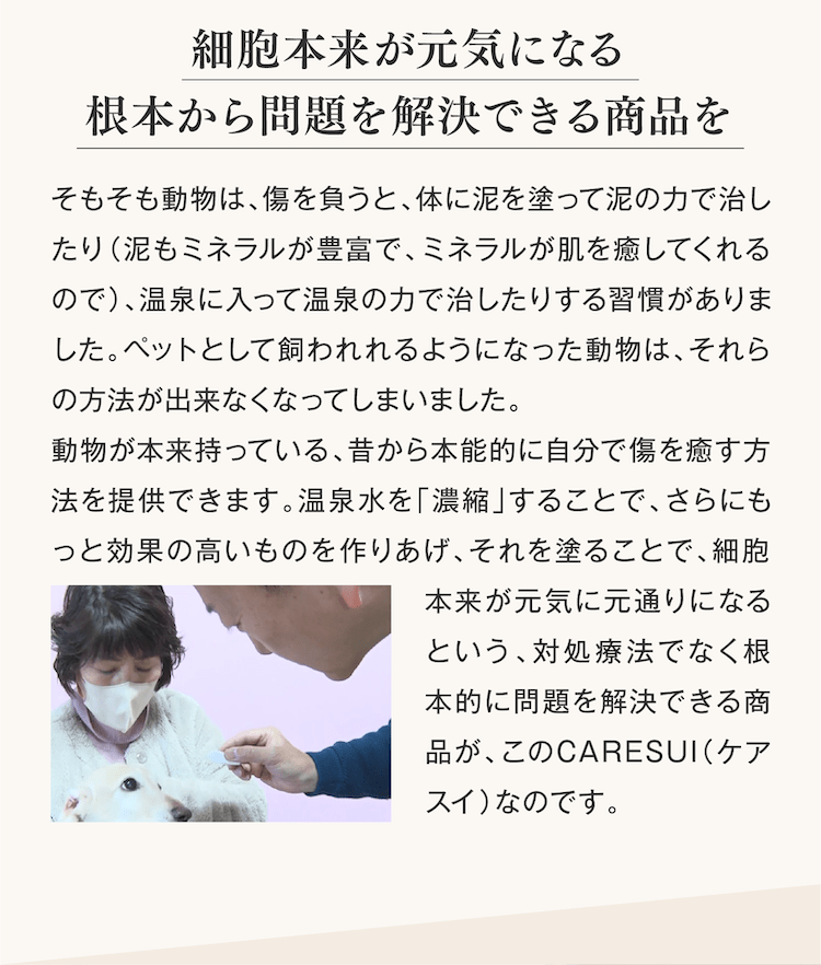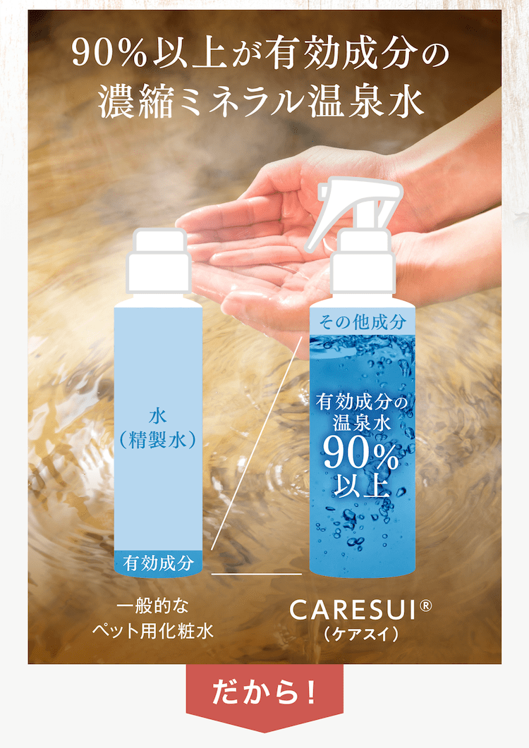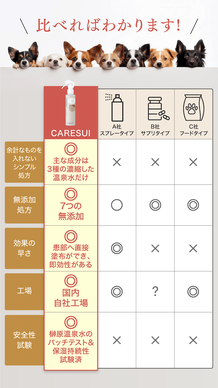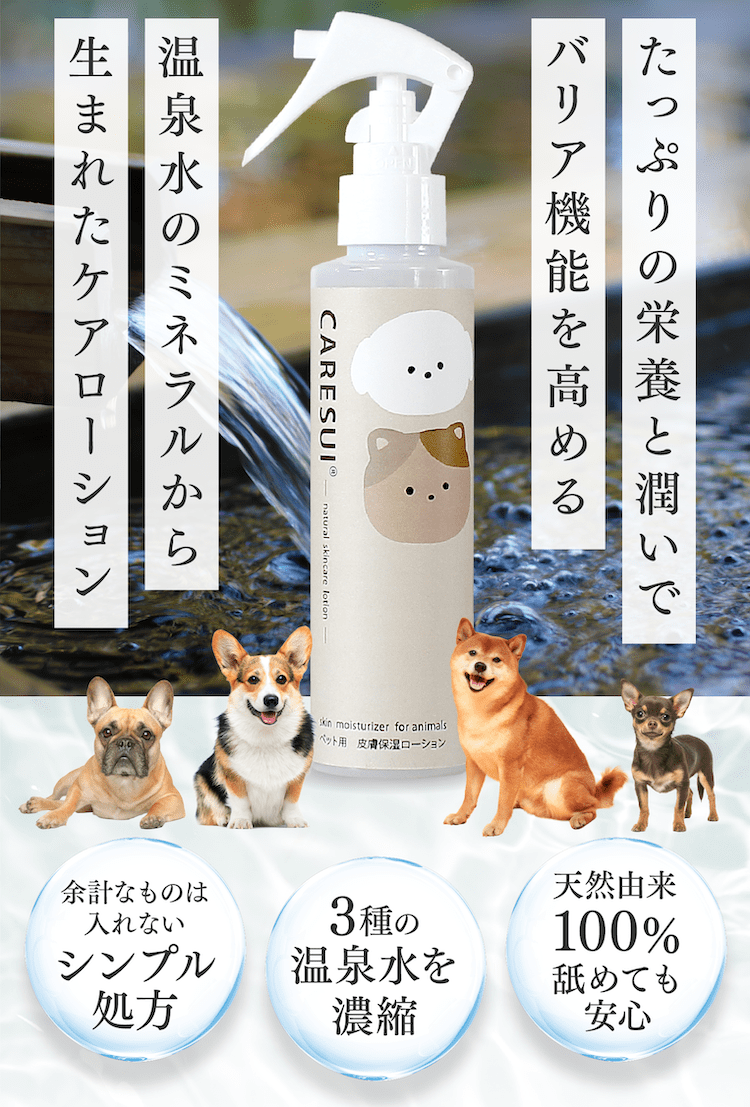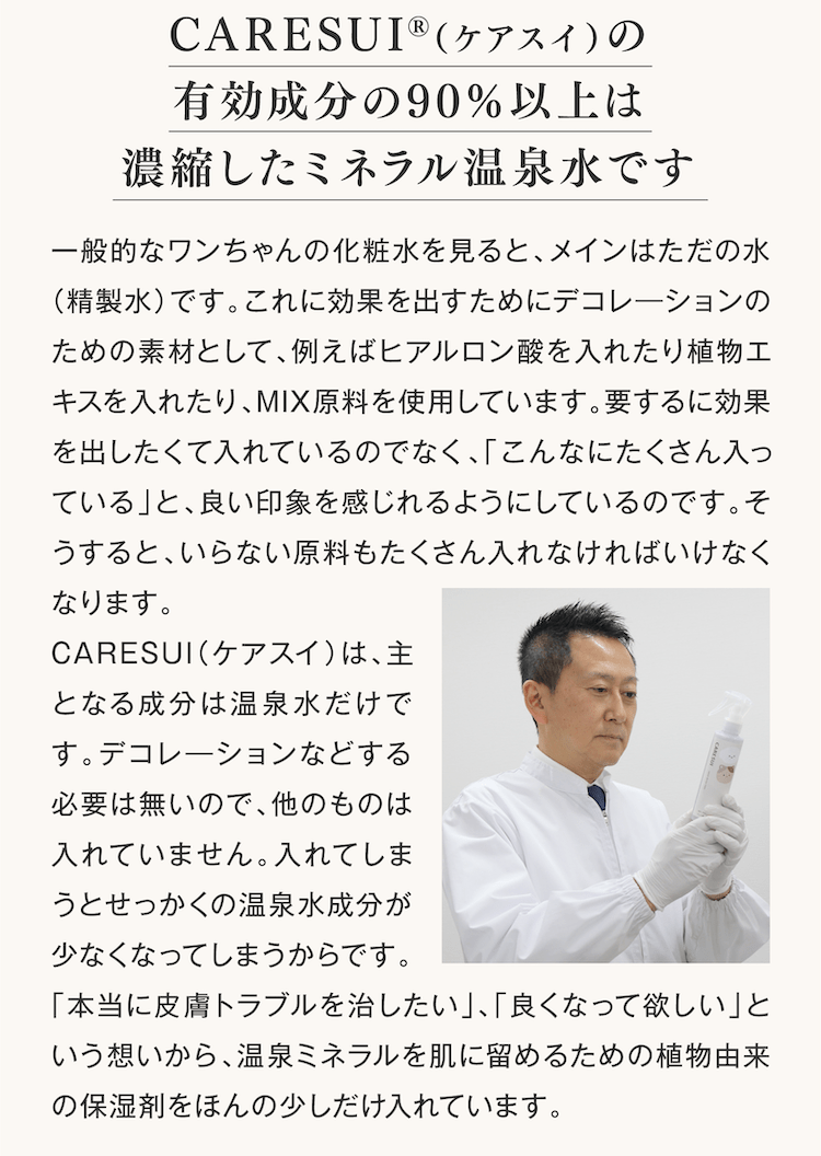 こんなお悩みありませんんか? 犬の4匹に1匹が皮膚トラブルに… なぜなら、犬の皮膚はとってもデリケート 犬の表皮は薄く人間の約1/3程度 スキンケアでしっかり保湿することが大切です 自然の力で皮膚トラブルを改善 ケアスイの3つの特徴 3種類の温泉水濃縮配合 高い効能を実現 すばやい浸透力と驚くような保湿力 濃縮ミネラルがうるおいを与え健やかな皮膚へ導きます 安心して使ってほしいから7つの無添加処方 余計なものは入れないシンプル処方