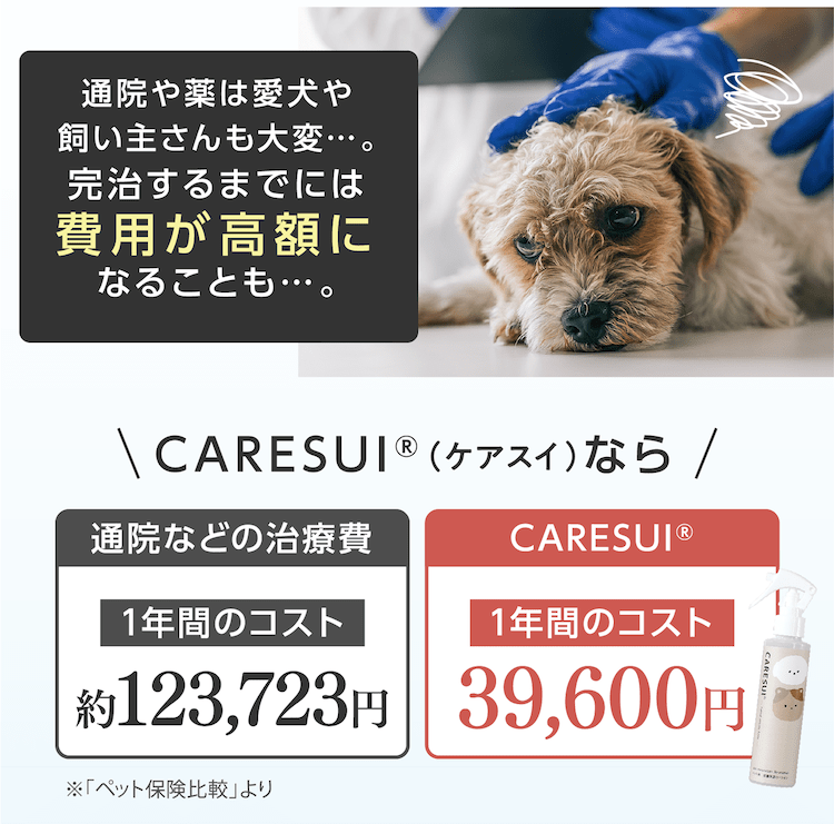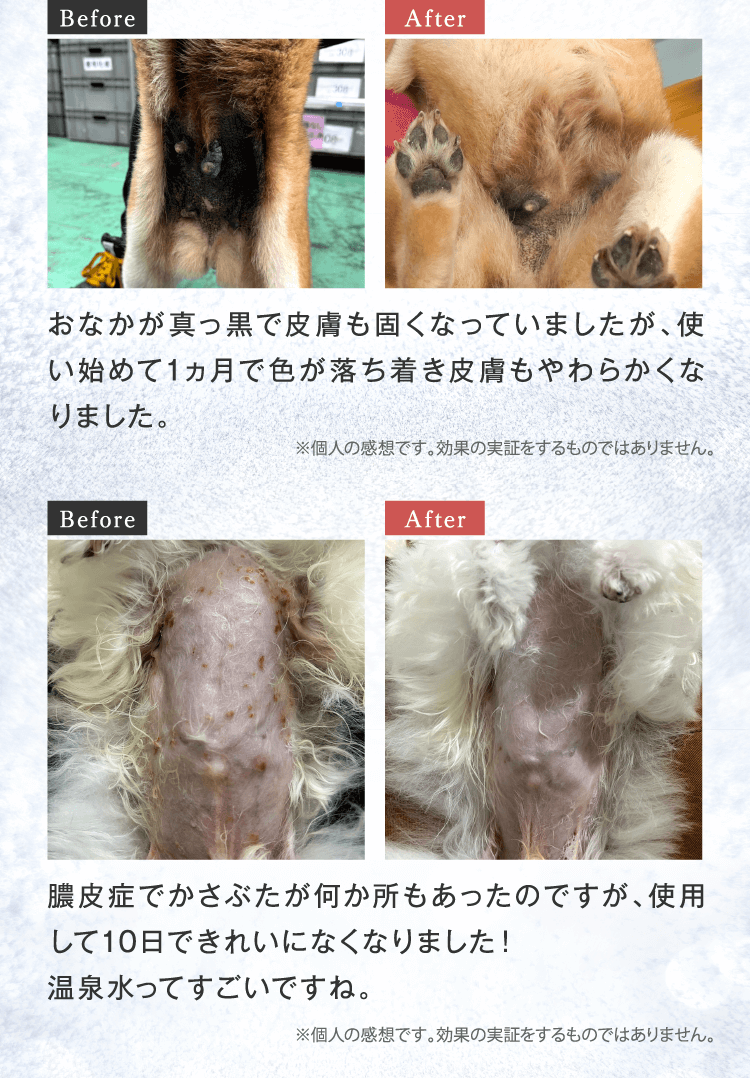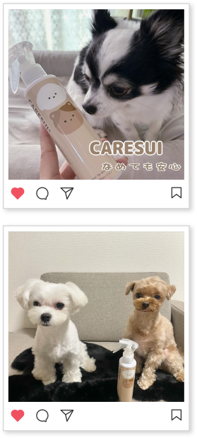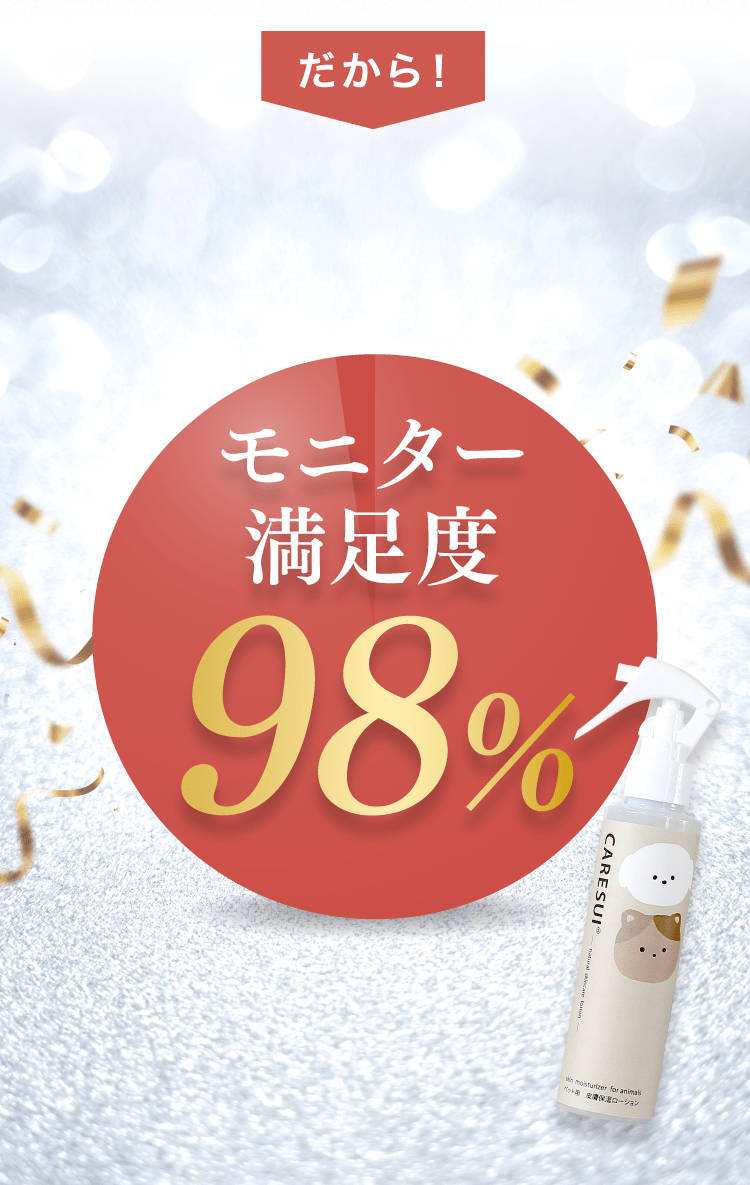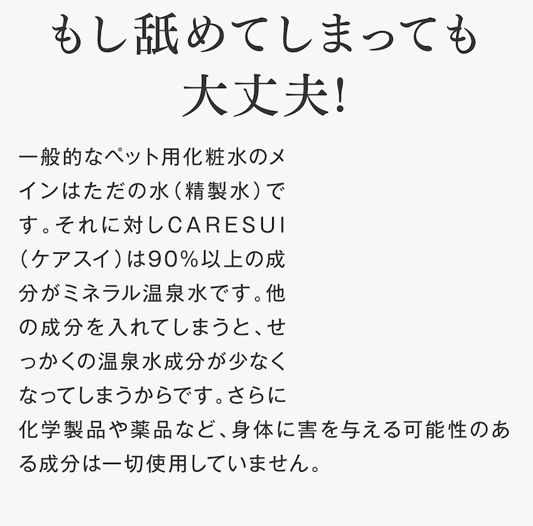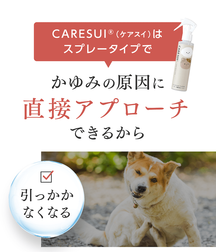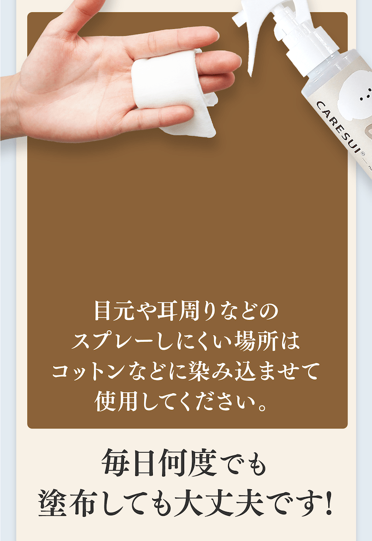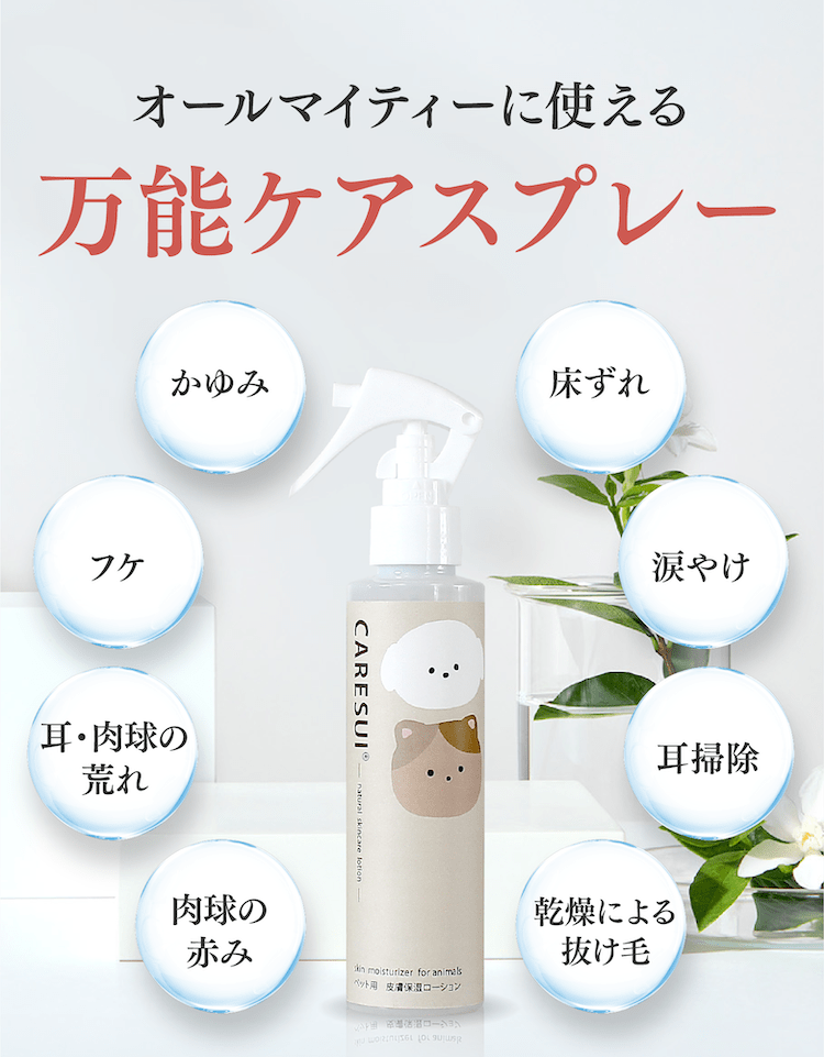 こんなお悩みありませんんか? 犬の4匹に1匹が皮膚トラブルに… なぜなら、犬の皮膚はとってもデリケート 犬の表皮は薄く人間の約1/3程度 スキンケアでしっかり保湿することが大切です 自然の力で皮膚トラブルを改善 ケアスイの3つの特徴 3種類の温泉水濃縮配合 高い効能を実現 すばやい浸透力と驚くような保湿力 濃縮ミネラルがうるおいを与え健やかな皮膚へ導きます 安心して使ってほしいから7つの無添加処方 余計なものは入れないシンプル処方