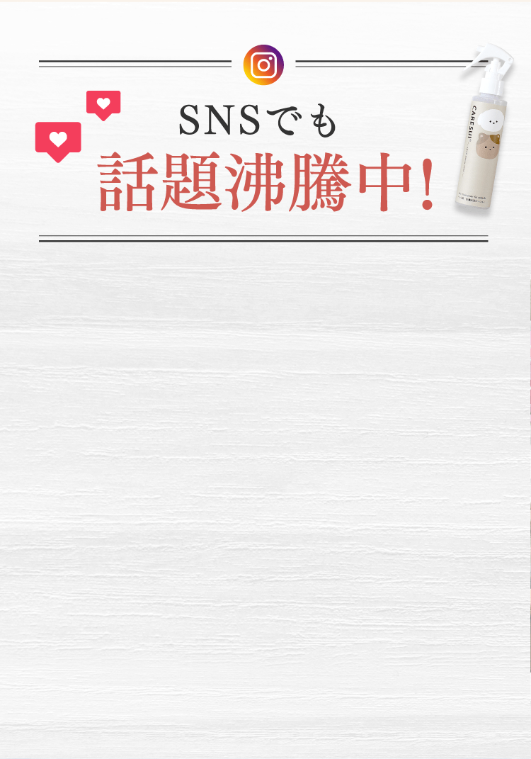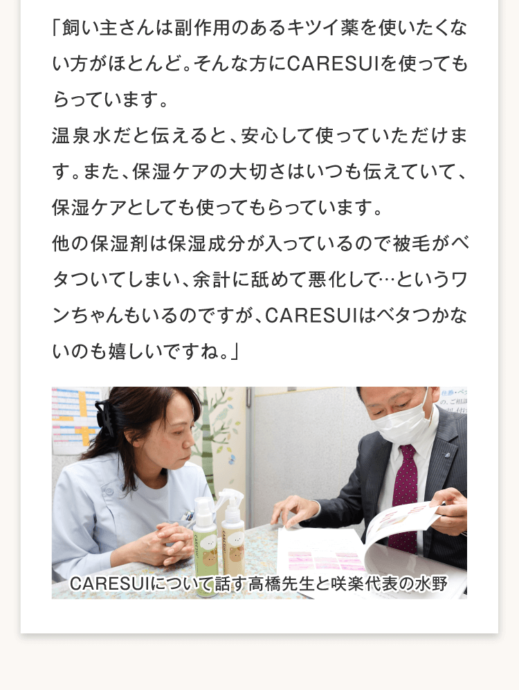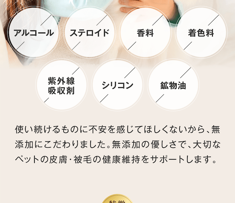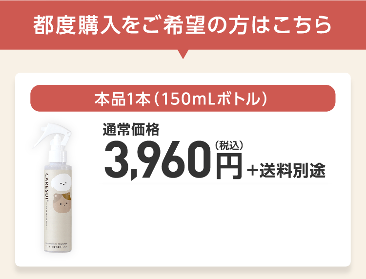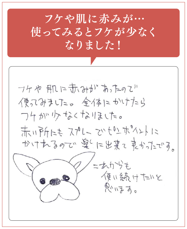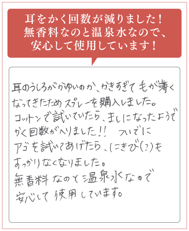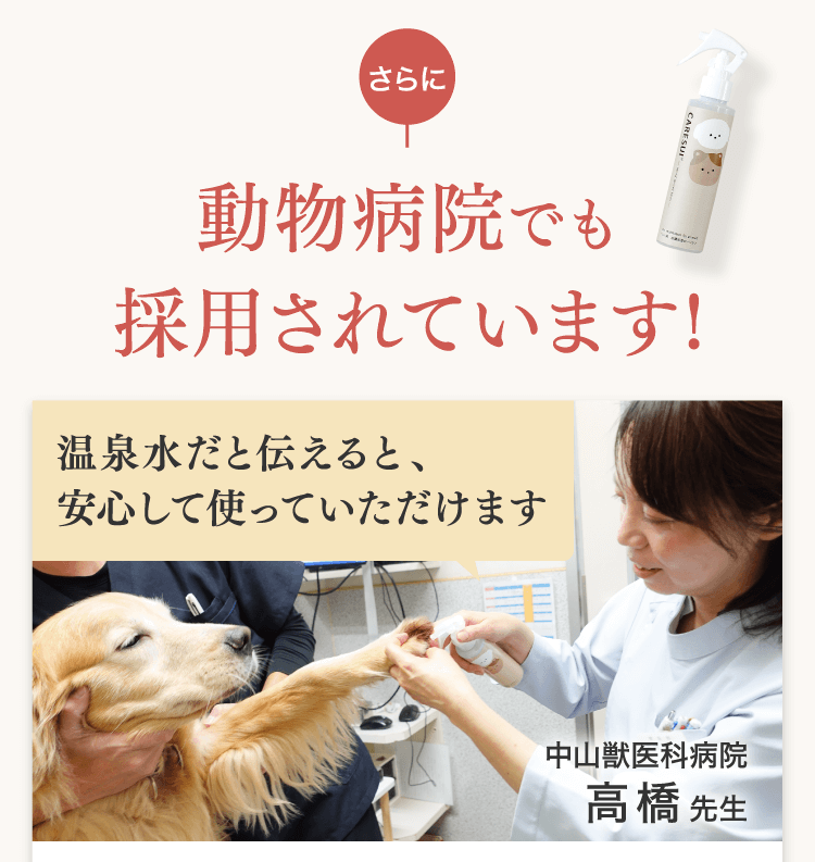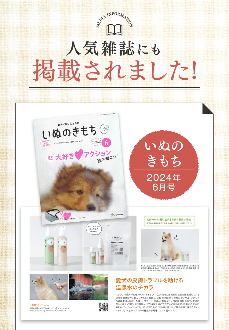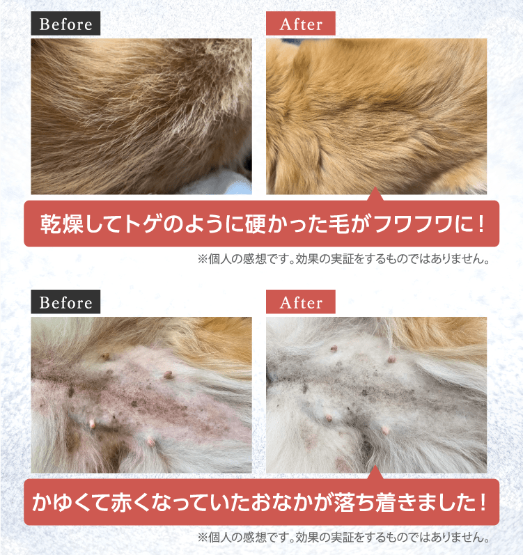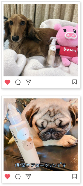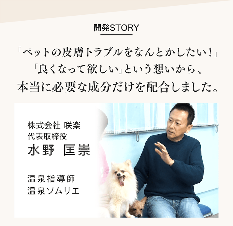 こんなお悩みありませんんか? 犬の4匹に1匹が皮膚トラブルに… なぜなら、犬の皮膚はとってもデリケート 犬の表皮は薄く人間の約1/3程度 スキンケアでしっかり保湿することが大切です 自然の力で皮膚トラブルを改善 ケアスイの3つの特徴 3種類の温泉水濃縮配合 高い効能を実現 すばやい浸透力と驚くような保湿力 濃縮ミネラルがうるおいを与え健やかな皮膚へ導きます 安心して使ってほしいから7つの無添加処方 余計なものは入れないシンプル処方