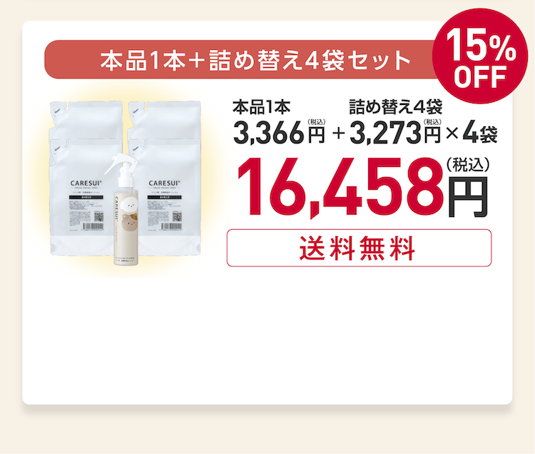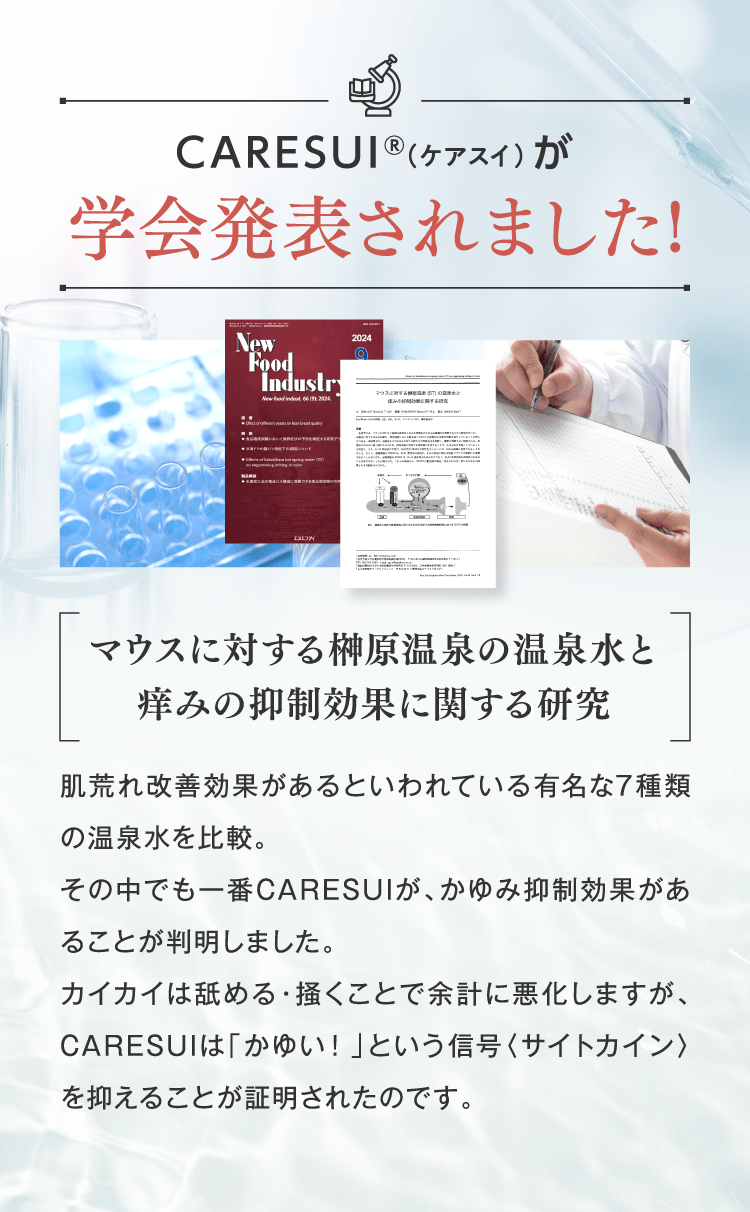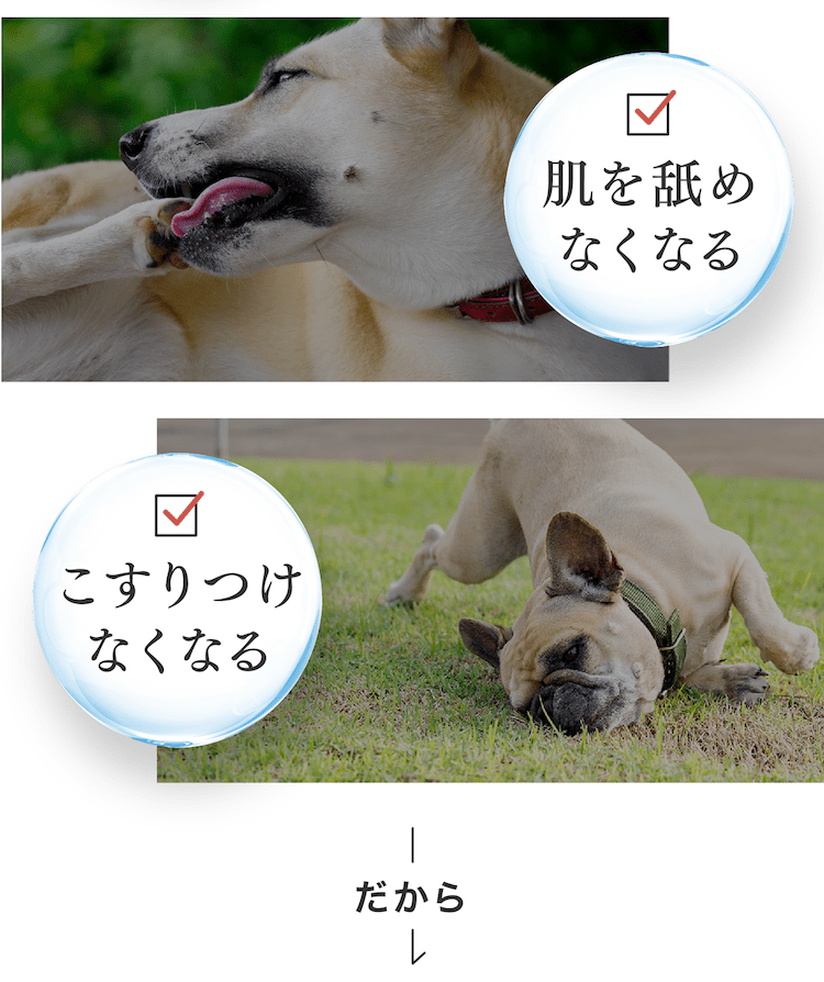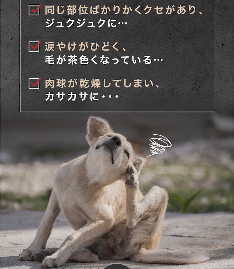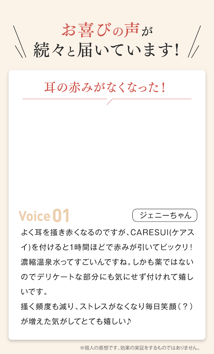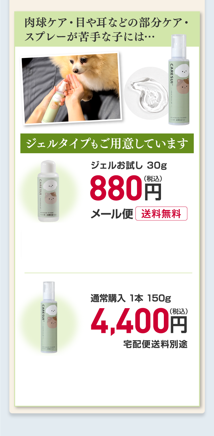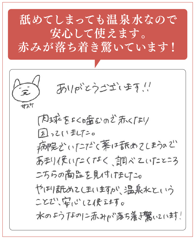こんなお悩みありませんんか? 犬の4匹に1匹が皮膚トラブルに… なぜなら、犬の皮膚はとってもデリケート 犬の表皮は薄く人間の約1/3程度 スキンケアでしっかり保湿することが大切です 自然の力で皮膚トラブルを改善 ケアスイの3つの特徴 3種類の温泉水濃縮配合 高い効能を実現 すばやい浸透力と驚くような保湿力 濃縮ミネラルがうるおいを与え健やかな皮膚へ導きます 安心して使ってほしいから7つの無添加処方 余計なものは入れないシンプル処方