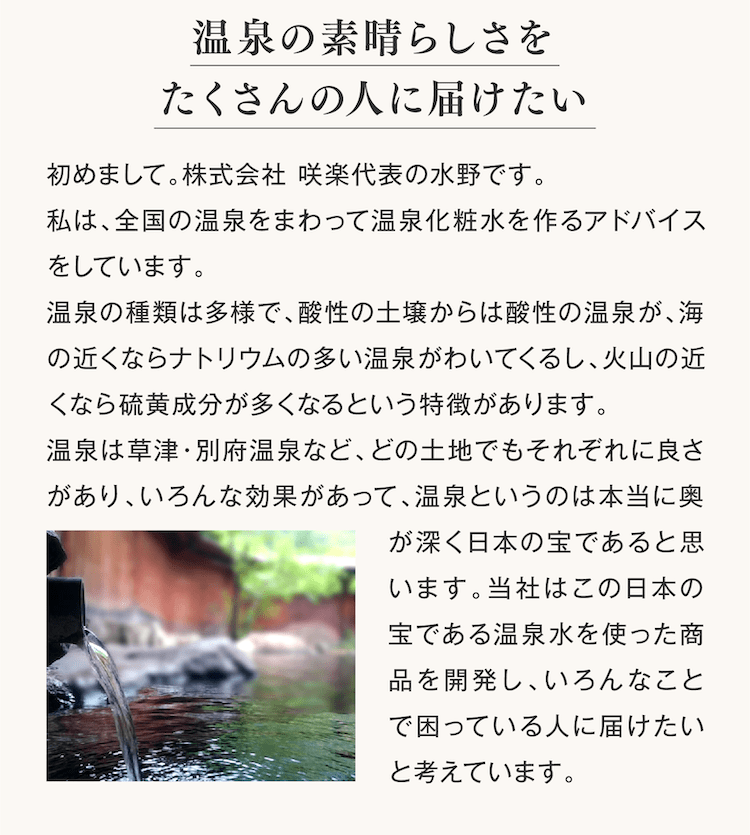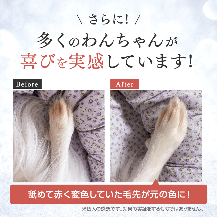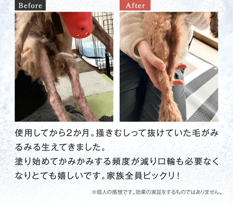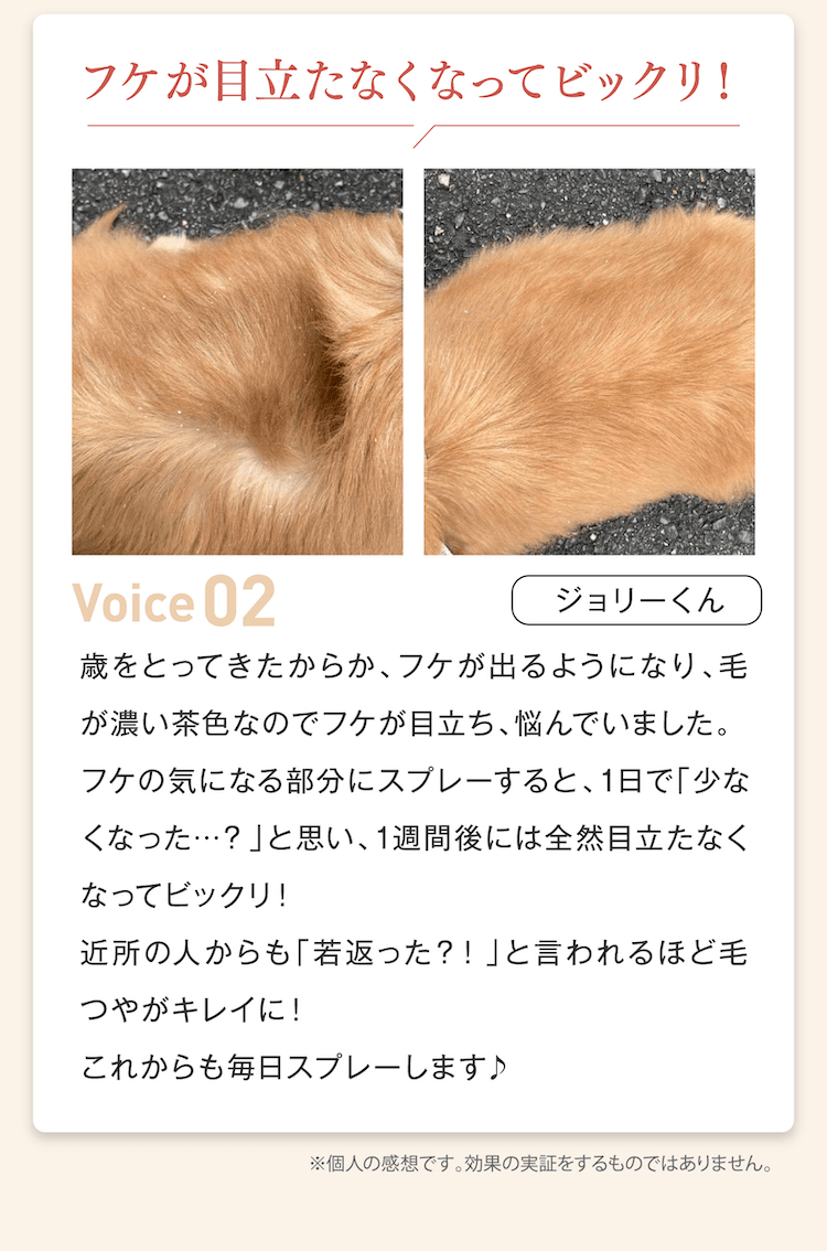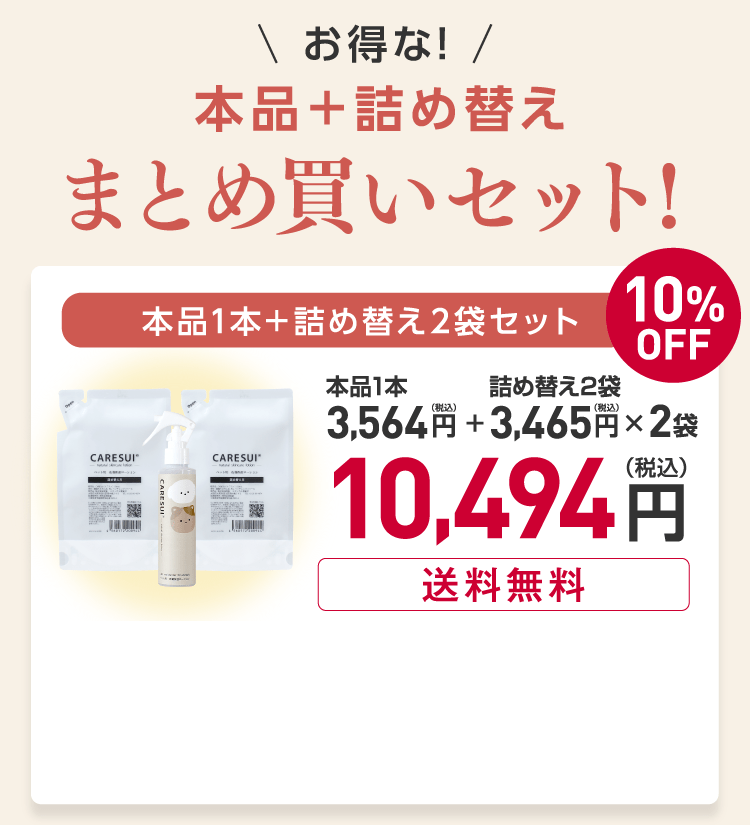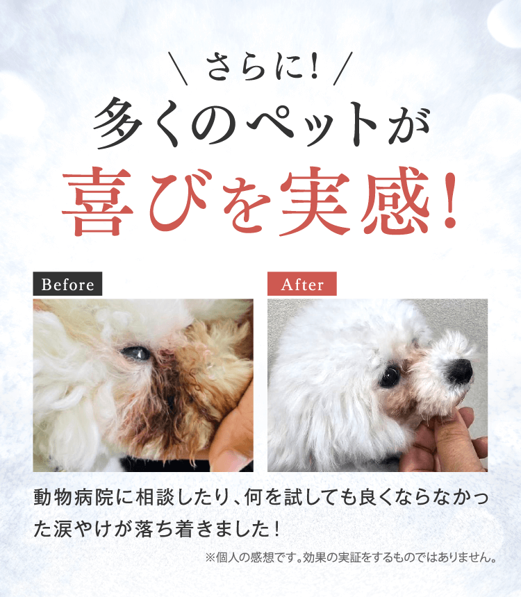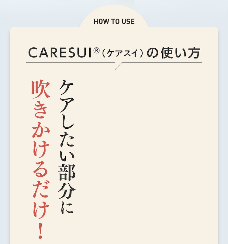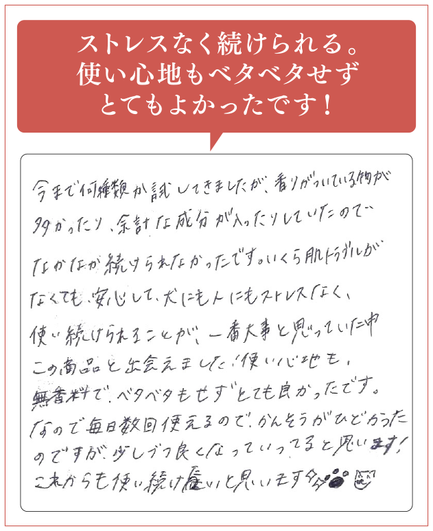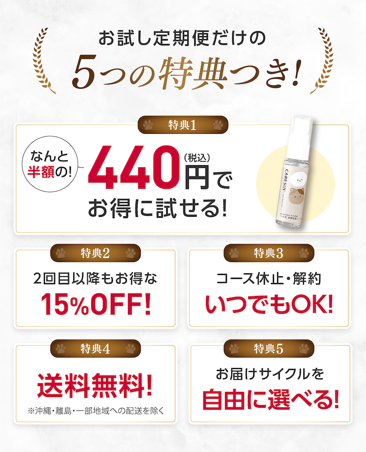 こんなお悩みありませんんか? 犬の4匹に1匹が皮膚トラブルに… なぜなら、犬の皮膚はとってもデリケート 犬の表皮は薄く人間の約1/3程度 スキンケアでしっかり保湿することが大切です 自然の力で皮膚トラブルを改善 ケアスイの3つの特徴 3種類の温泉水濃縮配合 高い効能を実現 すばやい浸透力と驚くような保湿力 濃縮ミネラルがうるおいを与え健やかな皮膚へ導きます 安心して使ってほしいから7つの無添加処方 余計なものは入れないシンプル処方